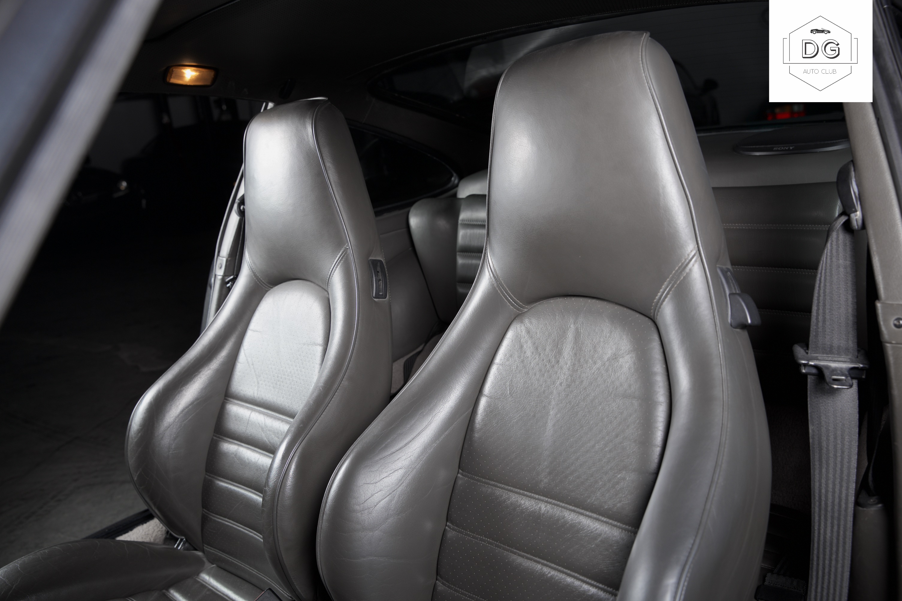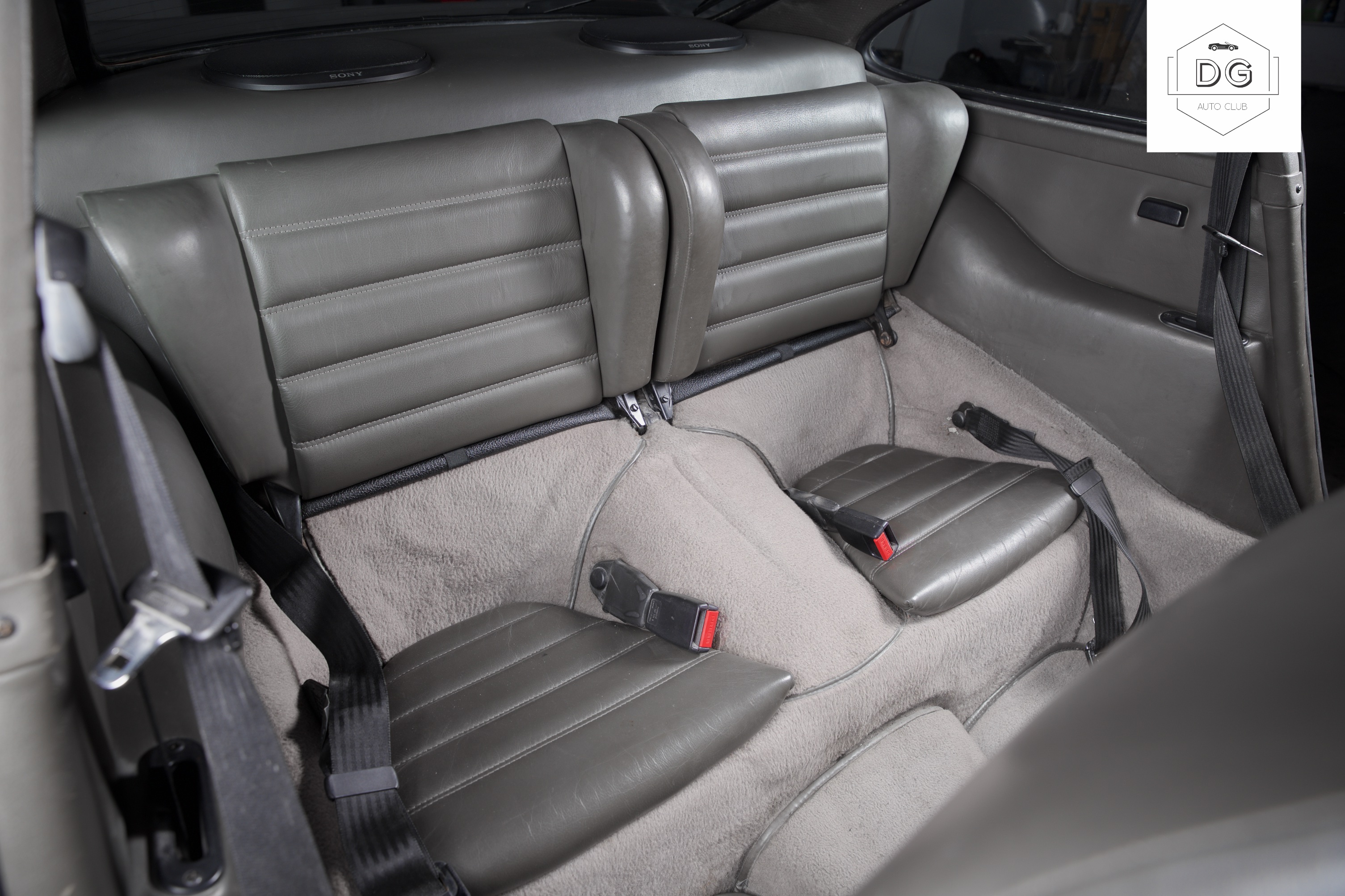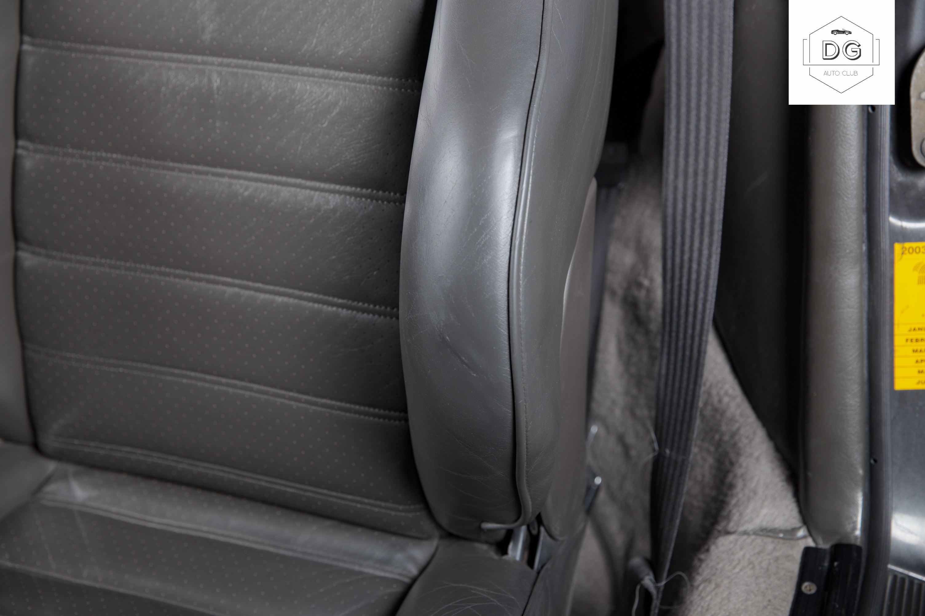 The interior features a special grey/darkgreen leather interior. The upholstery is in mostly good shape with some of the stitching coming undone on the steering wheel.