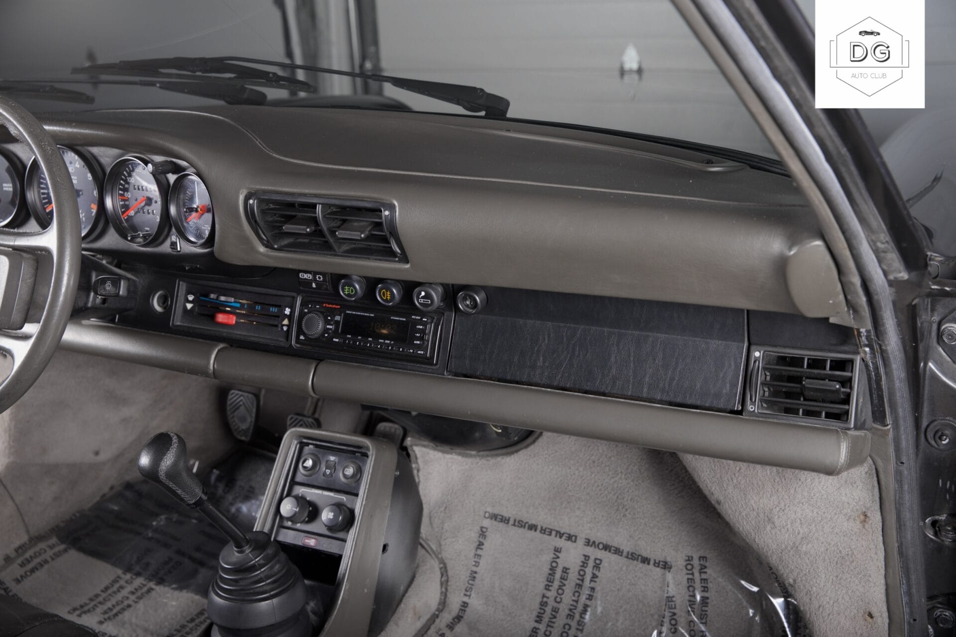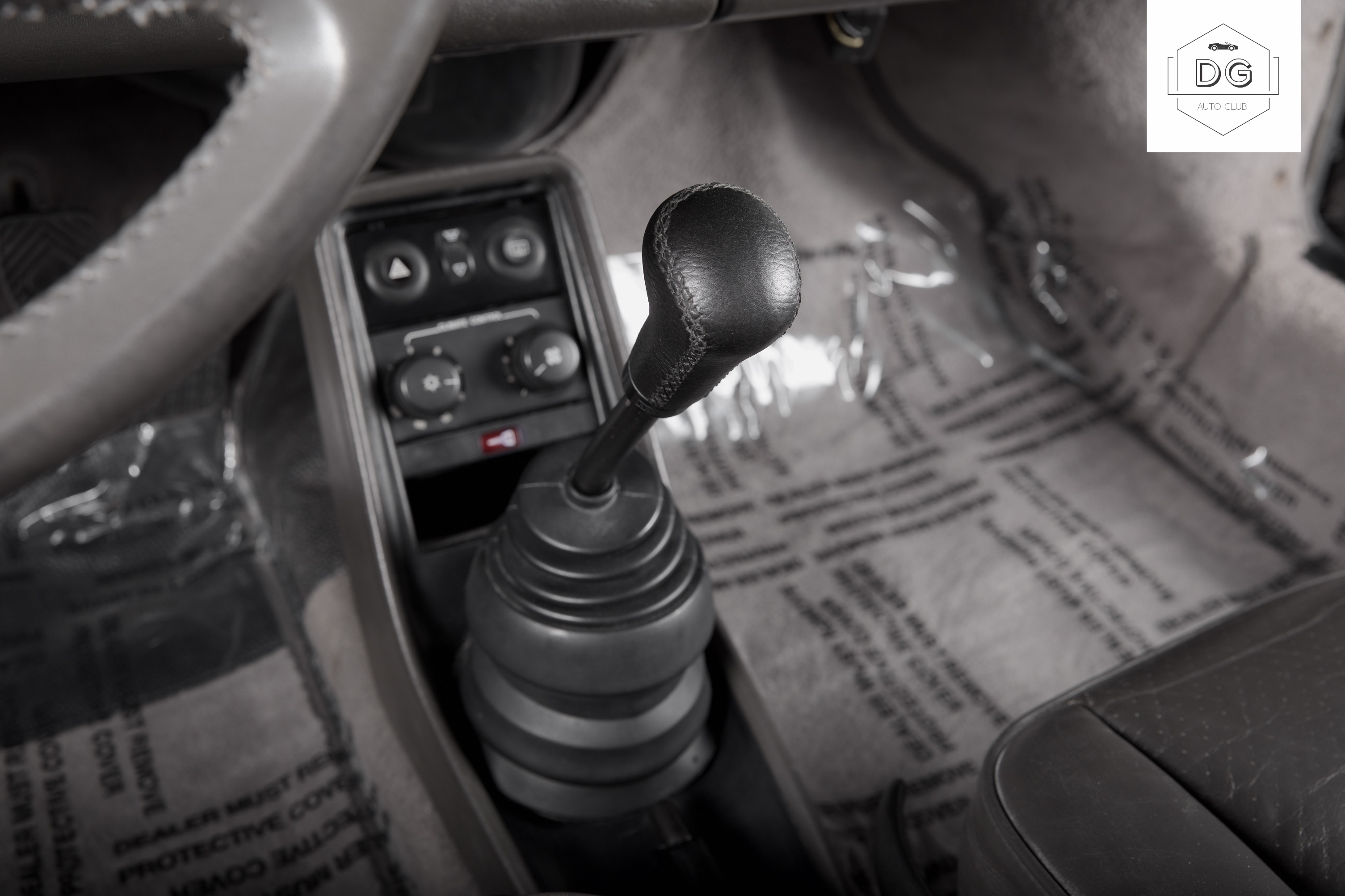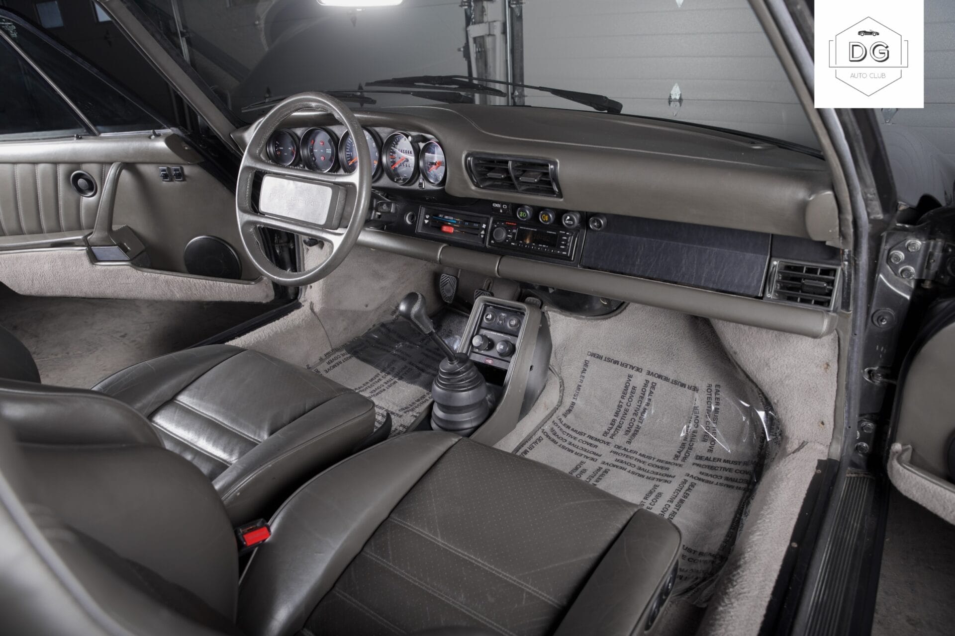 The interior features a special grey/darkgreen leather interior. The upholstery is in mostly good shape with some of the stitching coming undone on the steering wheel.