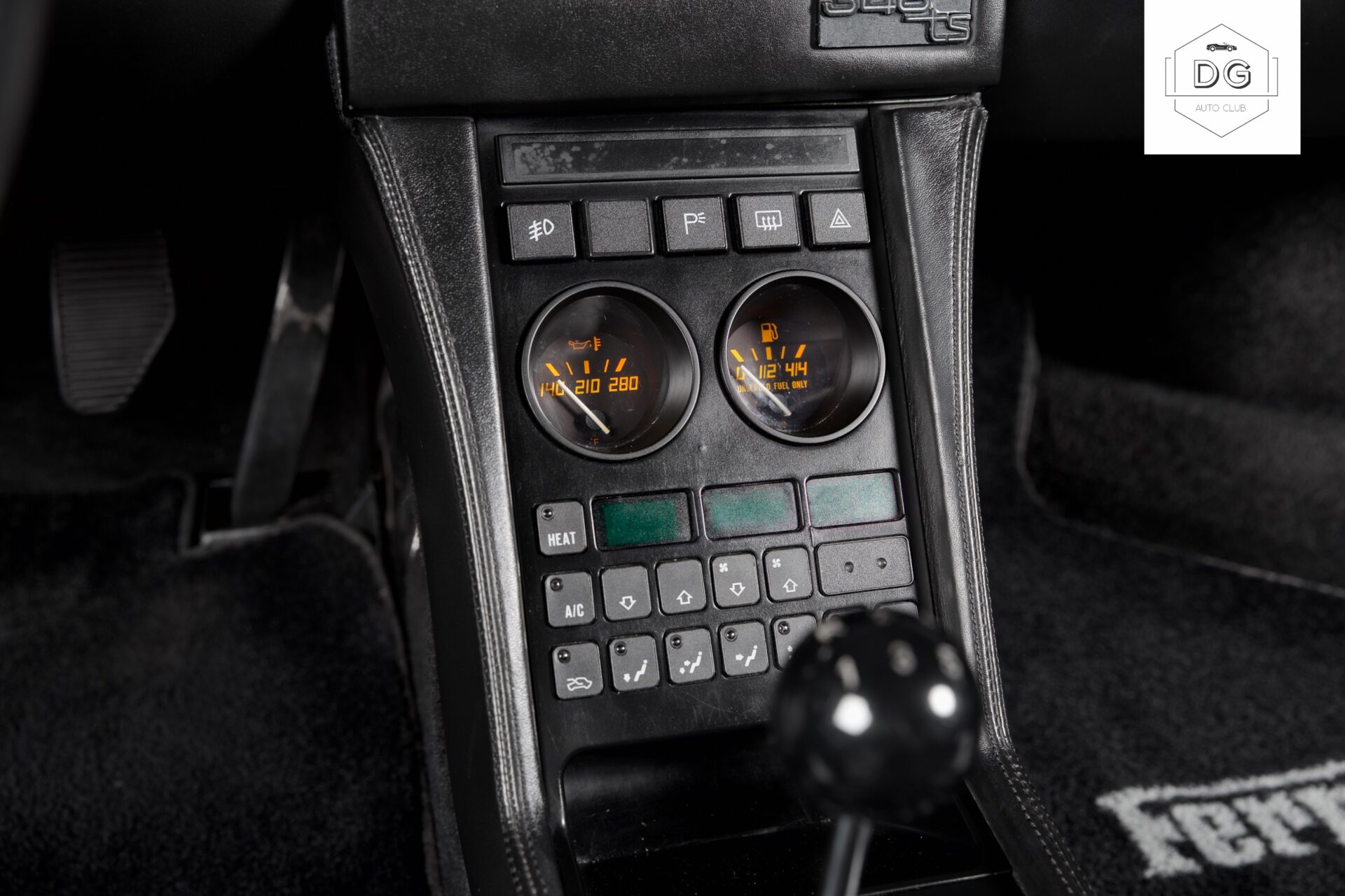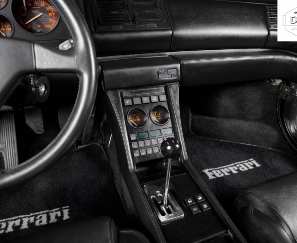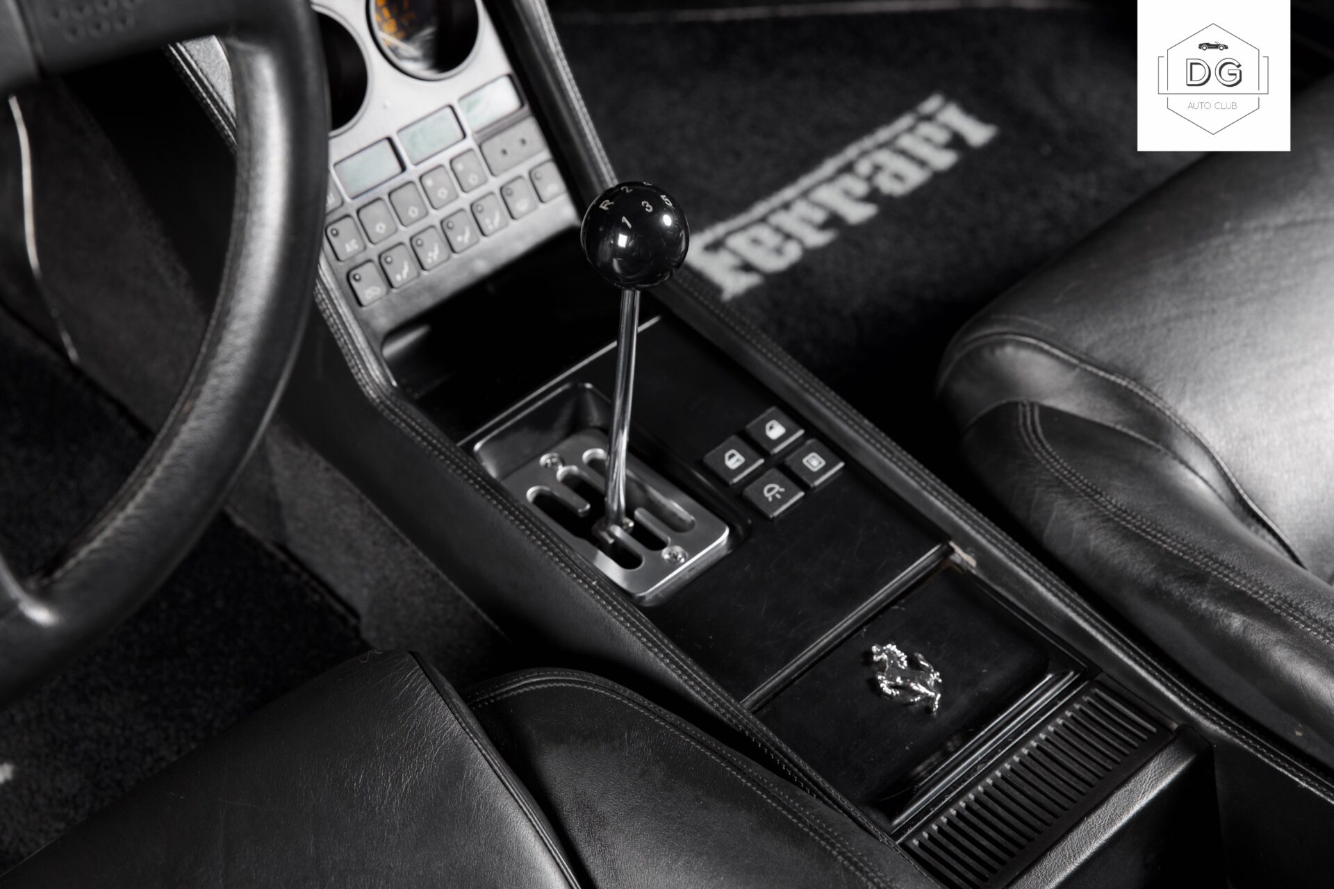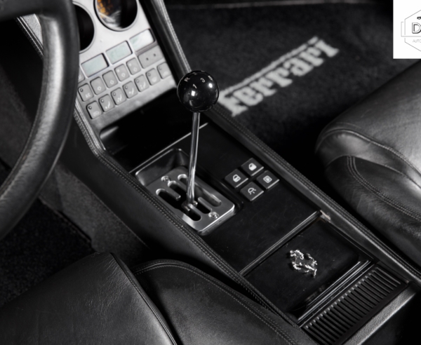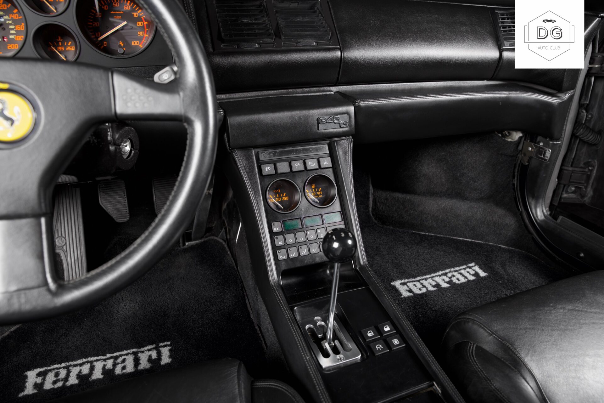 The Ferrari 348tb is powered by a 3.4L V8 engine producing 296 hp. Power is transferred through a dog-leg 5-speed manual transmission featuring a classic Italian gated (open) shifter.