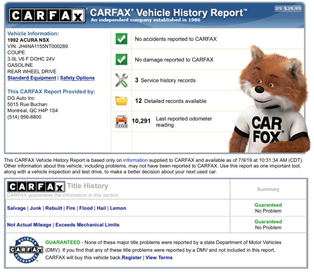 The car was delivered new to its original owner in 1992 in the United States. It was imported into Montreal, Canada in November 2005 and has remained there ever since.