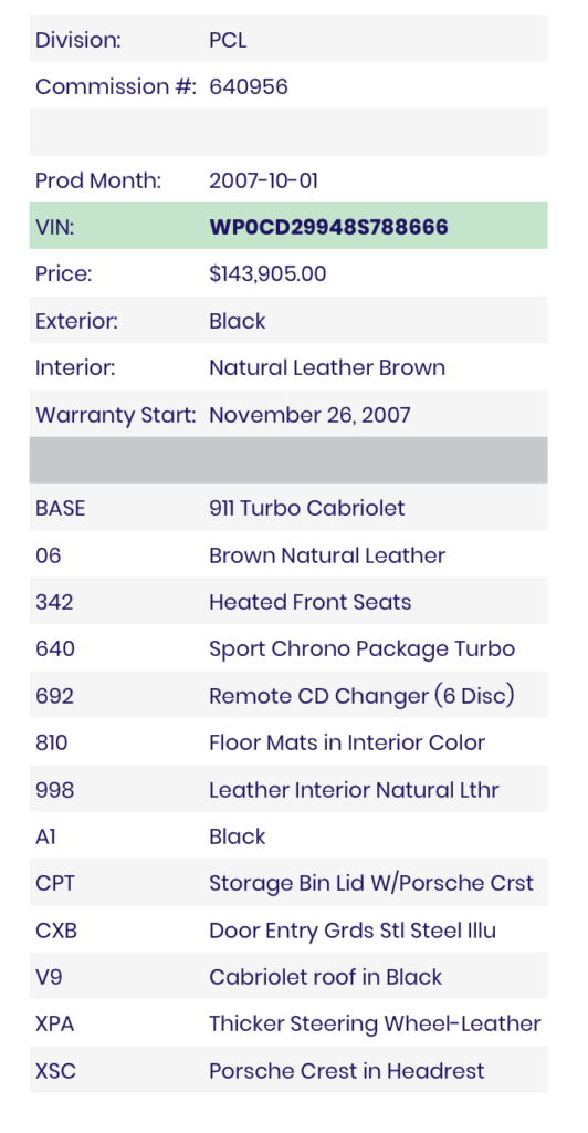 The vehicle was delivered to its original owner on December 19th 2007 at Porsche of San Diego in California. The car spent time in California (2007-09) and Florida (2009-10) before it was exported to Quebec, Canada in July 2010. The car has been in Quebec since 2010 and was recently re-imported into the United States (Champlain, NY) in December 2019 by DG Auto Club.