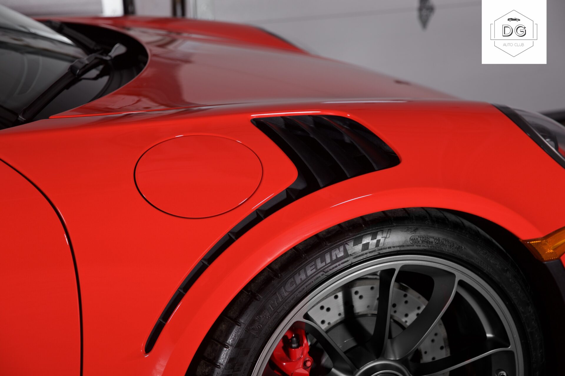 Porsche launched the RS version of the 991 GT3 at the Geneva Motor Show in 2015. Compared to the 991 GT3, the front fenders are now equipped with louvers above the wheels and the rear fenders now include Turbo-like intakes, rather than an intake below the rear wing.