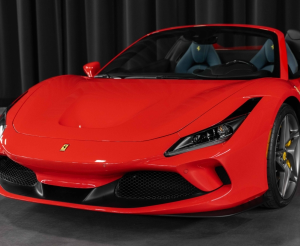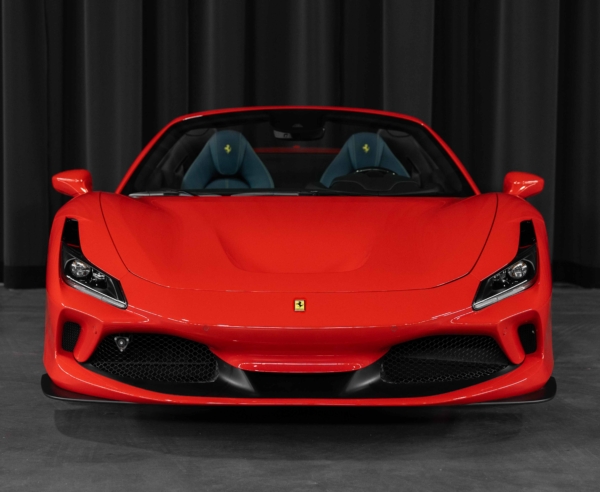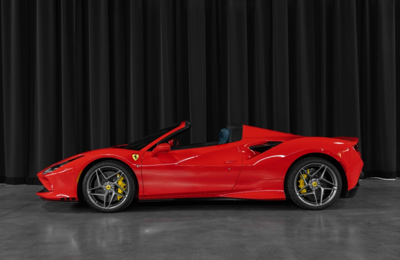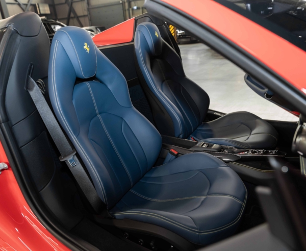 2023 Ferrari F8 Spider finished in a Rosso Scuderia exterior paint. The interior features two-tone Blue Medio and black leather upholstery with yellow deviating stitching and carbon fiber trim.