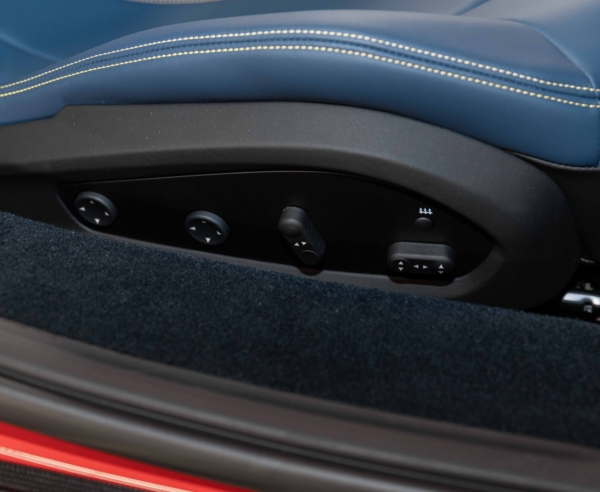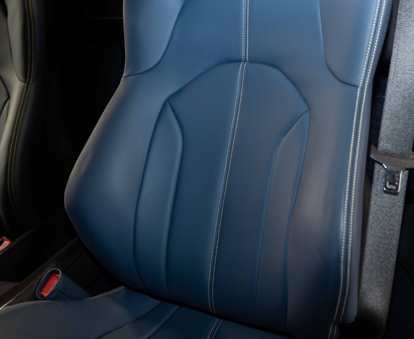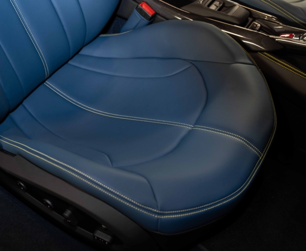The car’s interior features two-tone Blue Medio and black leather upholstery with yellow deviating stitching and carbon fiber trim.